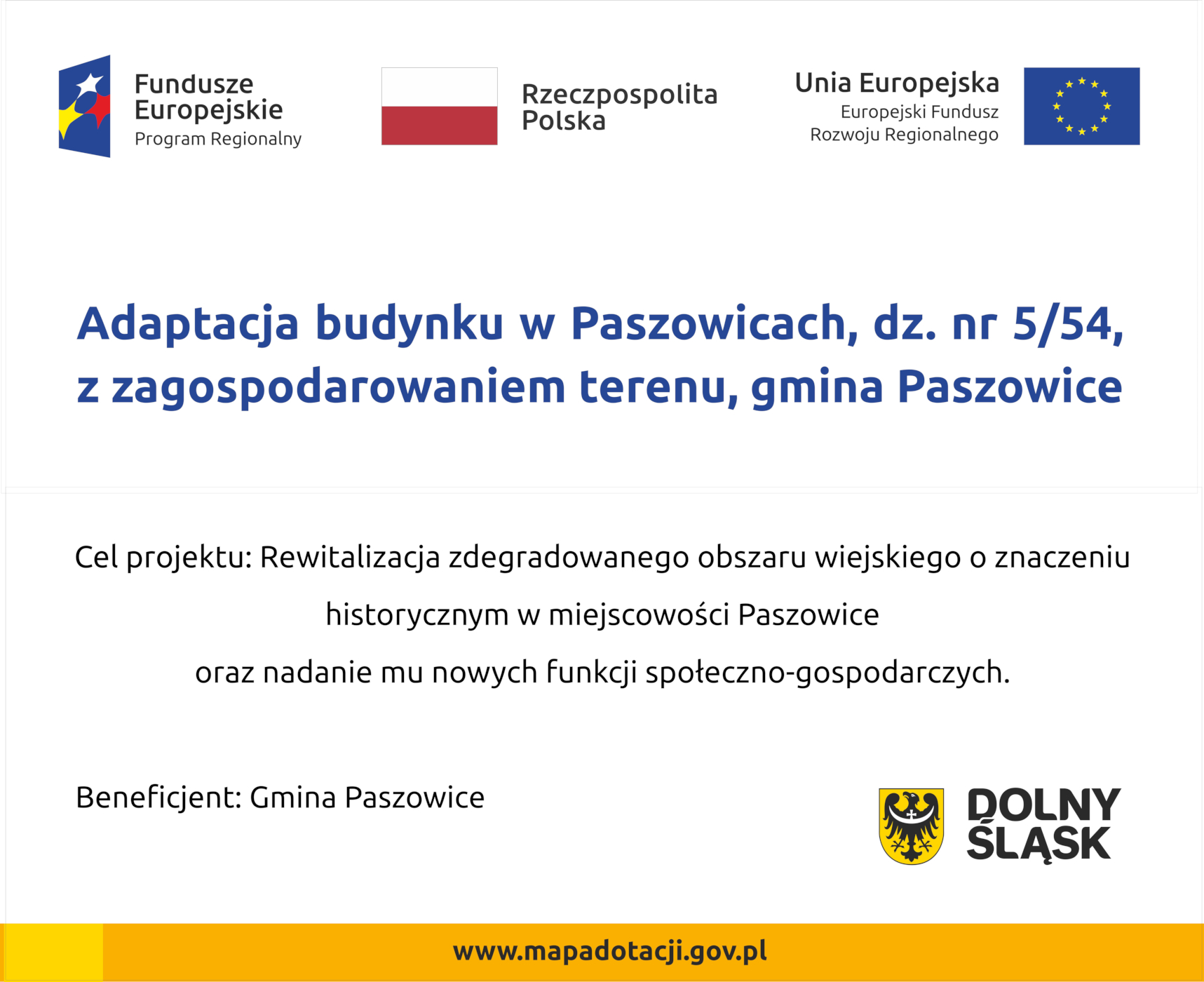 Cel projektu: Rewitalizacja zdegradowanego obszaru wiejskiego o znaczeniu historycznym w miejscowości Paszowice oraz nadanie mu nowych funkcji społeczno-gospodarczych.