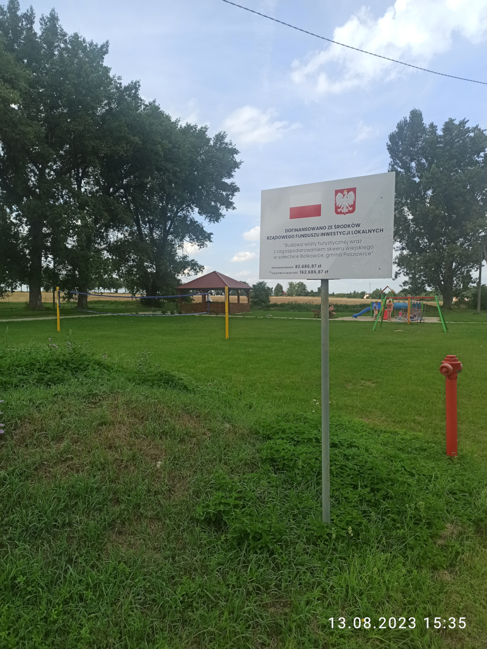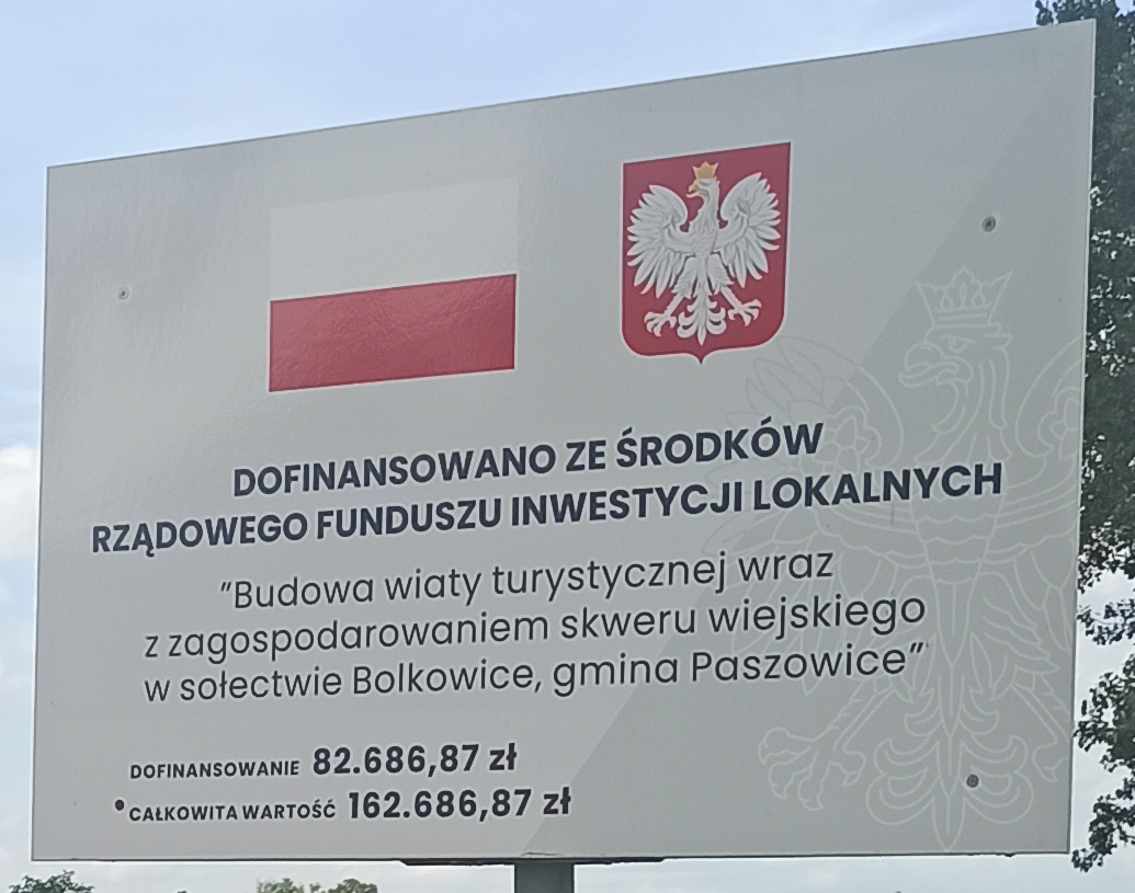 Nazwa projektu: Budowa wiaty turystycznej wraz z zagospodarowaniem skweru wiejskiego w sołectwie Bolkowice, gmina Paszowice.