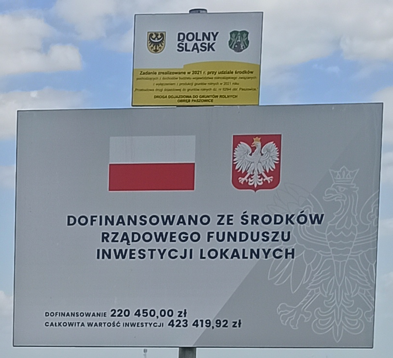 Nazwa projektu: Przebudowa drogi dojazdowej do gruntów rolnych dz. nr 629/4 obr. Paszowice Dofinansowano ze środków Rządowego Funduszu Inwestycji Lokalnych. Wartość dofinansowania: 220 450,00 zł Wartość całkowita: 423 419,92 zł