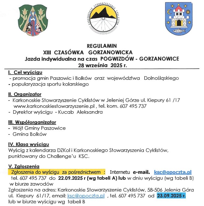 REGULAMIN XIII CZASÓWKA GORZANOWICKA JAZDA INDYWIDUALNA NA CZAS POGWIZDÓW - GORZANOWICE 28 września 2025 r.Archiwum