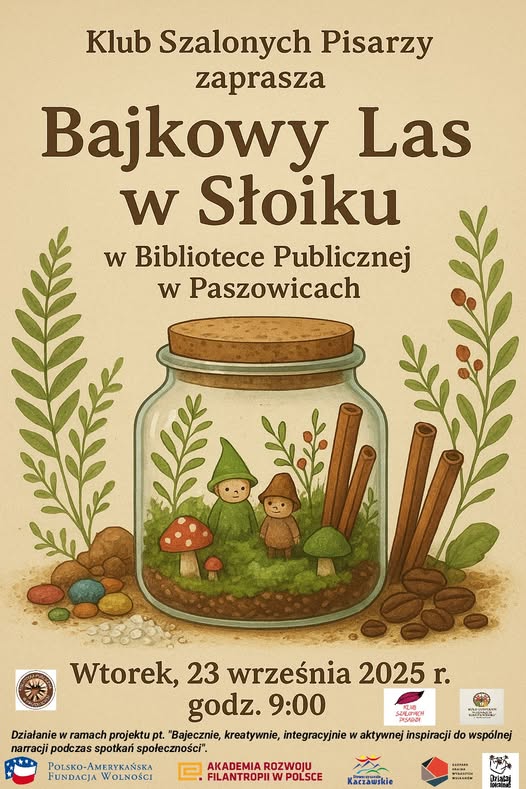 Kolejnym z działań będą warsztaty kreatywne - BAJKOWY LAS W SŁOIKU, które odbędą się we wtorek, 23 września 2025 r. o godz. 9:00 w Bibliotece Publicznej w Paszowicach. Przed przystąpieniem do pracy zostanie odczytana bajka i bajkowa instrukcja.