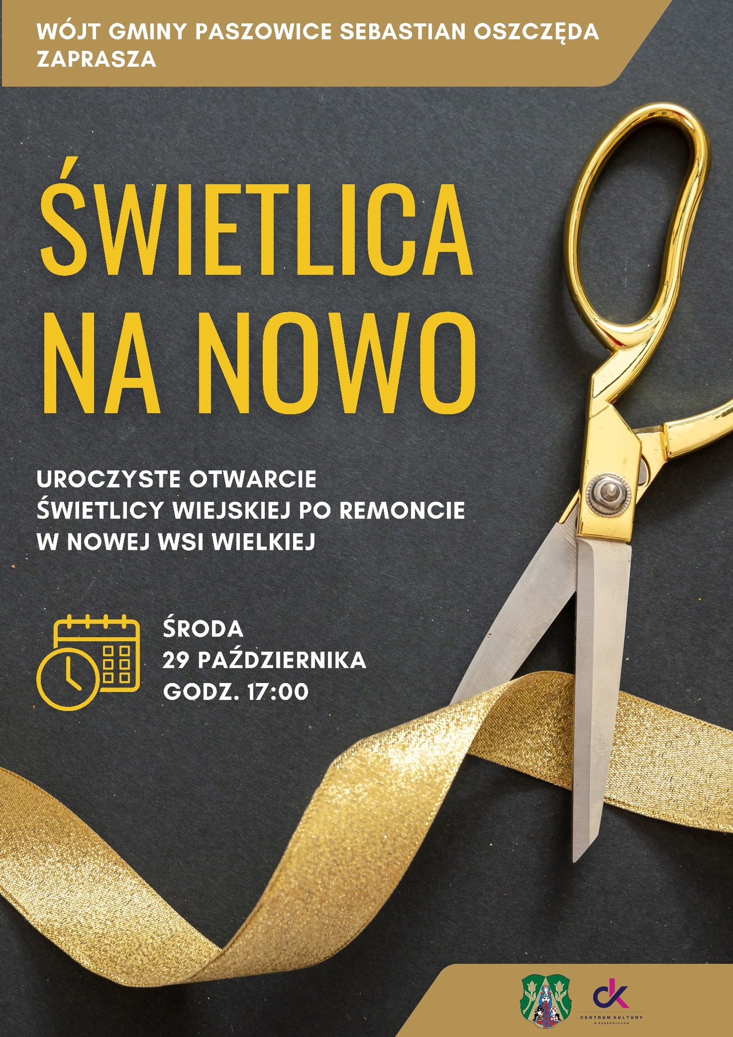 Nowa Wieś Wielka - Świetlica na nowoWójt Gminy Paszowice Sebastian Oszczęda zaprasza na uroczyste otwarcie świetlicy wiejskiej po remoncie w Nowej Wsi Wielkiej! Data: Środa: Miejsce: