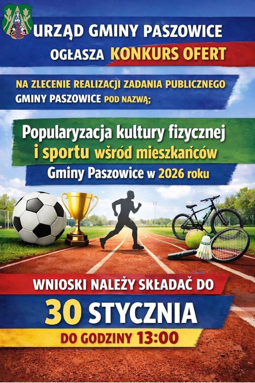 Wójt Gminy Paszowice, działając na podstawie art. 11 ust. 2 oraz art. 13 ustawy z dnia 24 kwietnia 2003 r. o działalności pożytku publicznego i o wolontariacie (Dz. U. z 2025 r. poz. 1338), ogłasza otwarty konkurs ofert na zlecenie realizacji zadań publicznych Gminy Paszowice z zakresu kultury fizycznej i sportu w 2026 roku.