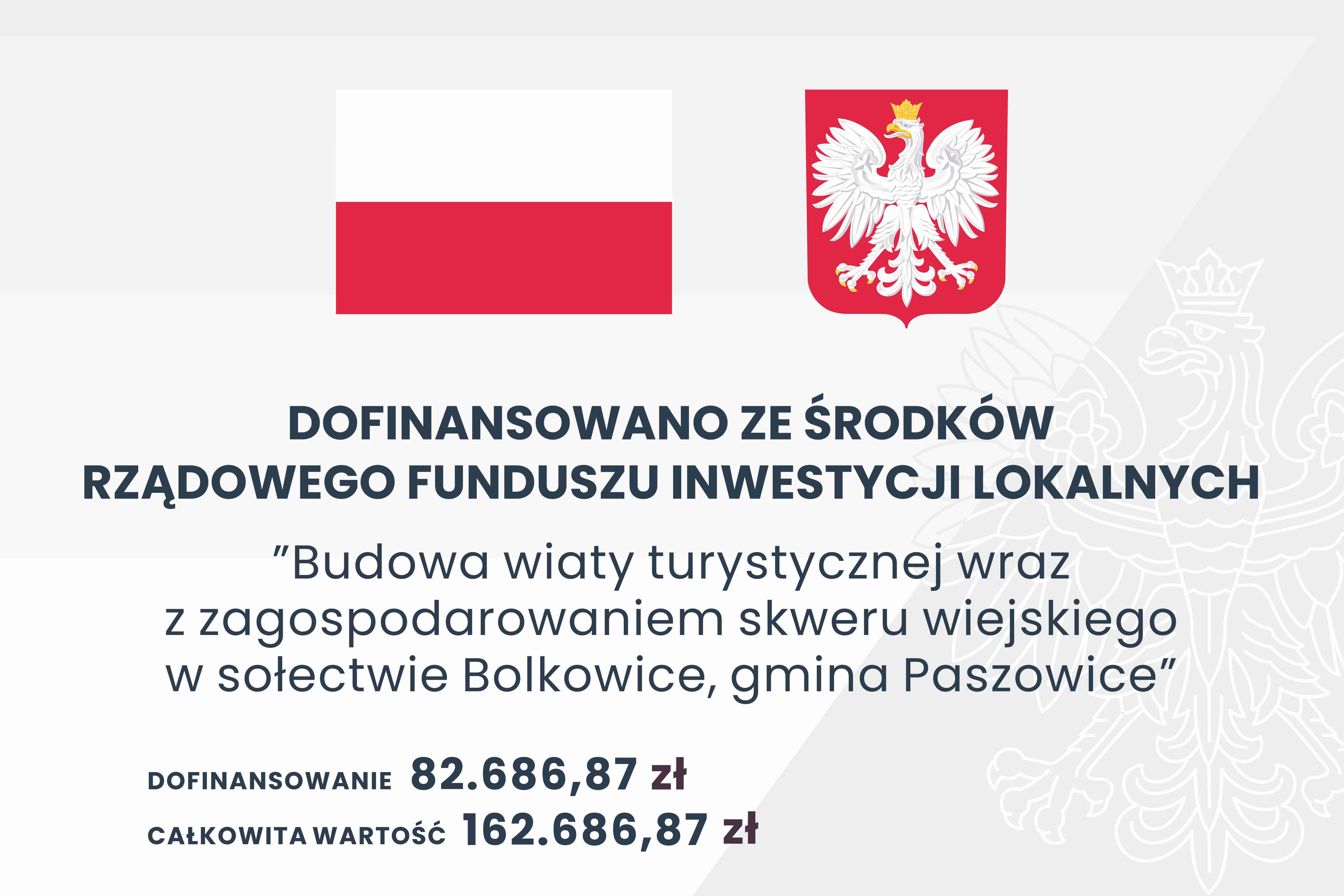 Nazwa projektu: Budowa wiaty turystycznej wraz z zagospodarowaniem skweru wiejskiego w sołectwie Bolkowice, gmina Paszowice.