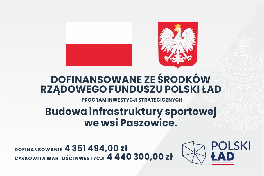 Nazwa projektu: Budowa infrastruktury sportowej we wsi Paszowice Dofinansowano ze środków Rządowego Funduszu Polski Ład Programu Inwestycji Strategicznych. Wartość dofinansowania: 4 351 494,00 zł Wartość całkowita: 4 440 300,00 zł